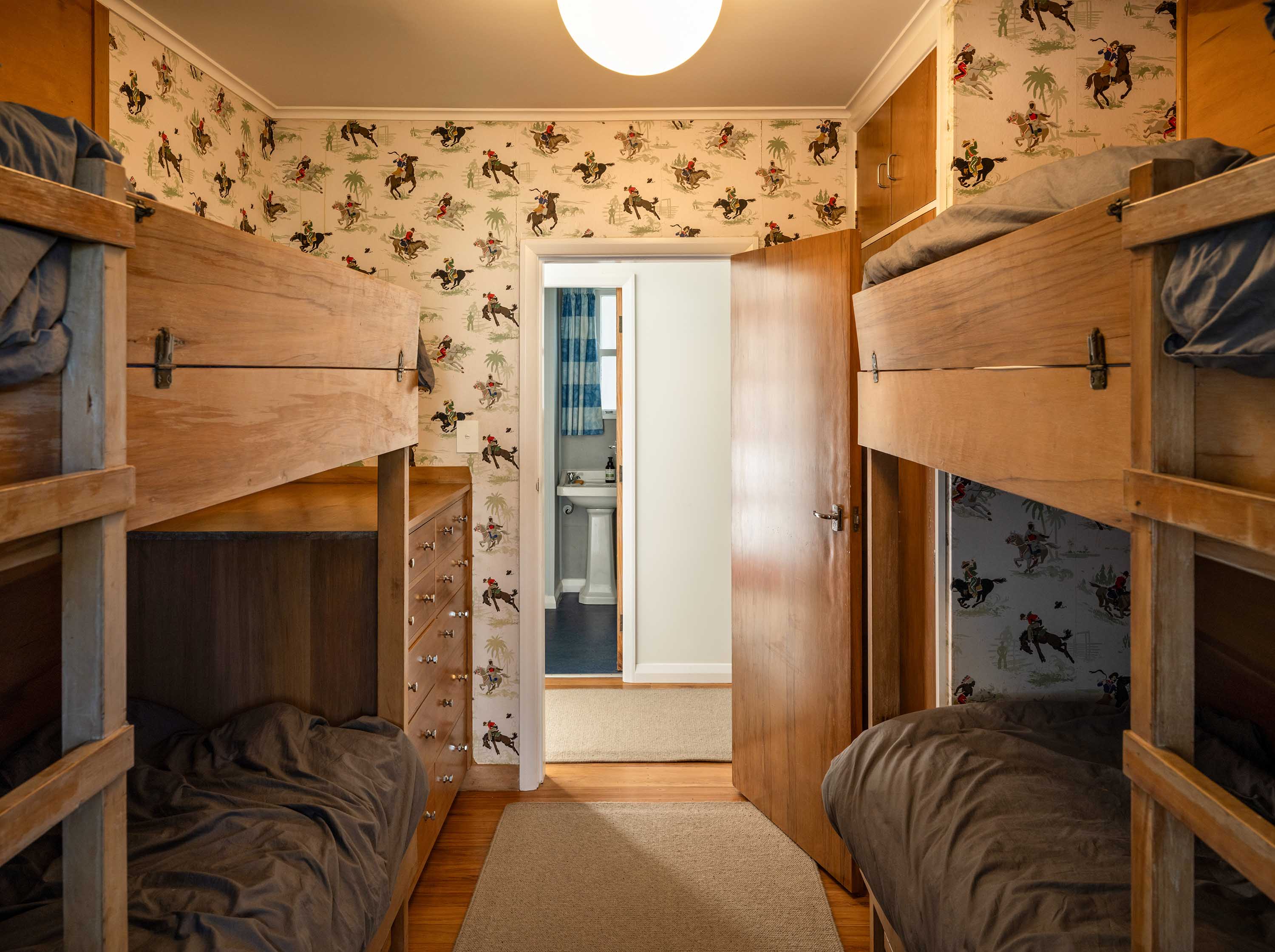The vertical timber slatting that ties the new additions to the old structure was another considered decision. A glass balustrade, Gardyne felt, would be impractical in the salt air and aesthetically foreign to the mid-century house. The timber work, meanwhile, creates patterns of light and shadow that shift through the day, knitting decades of building into a coherent whole. Dunlop and his partner and dogs now drive up from Wellington every fortnight, 50 minutes on the motorway, arriving in a different climate, a different light, a different life. His brothers and sisters and their families still use the house from time to time. Grandchildren and great-grandchildren sleep in the bunks Dunlop's grandfather once slept in, under that Wild West wallpaper. And now, 70-odd years after it was built, with five generations passing through, it’s being used more than ever.