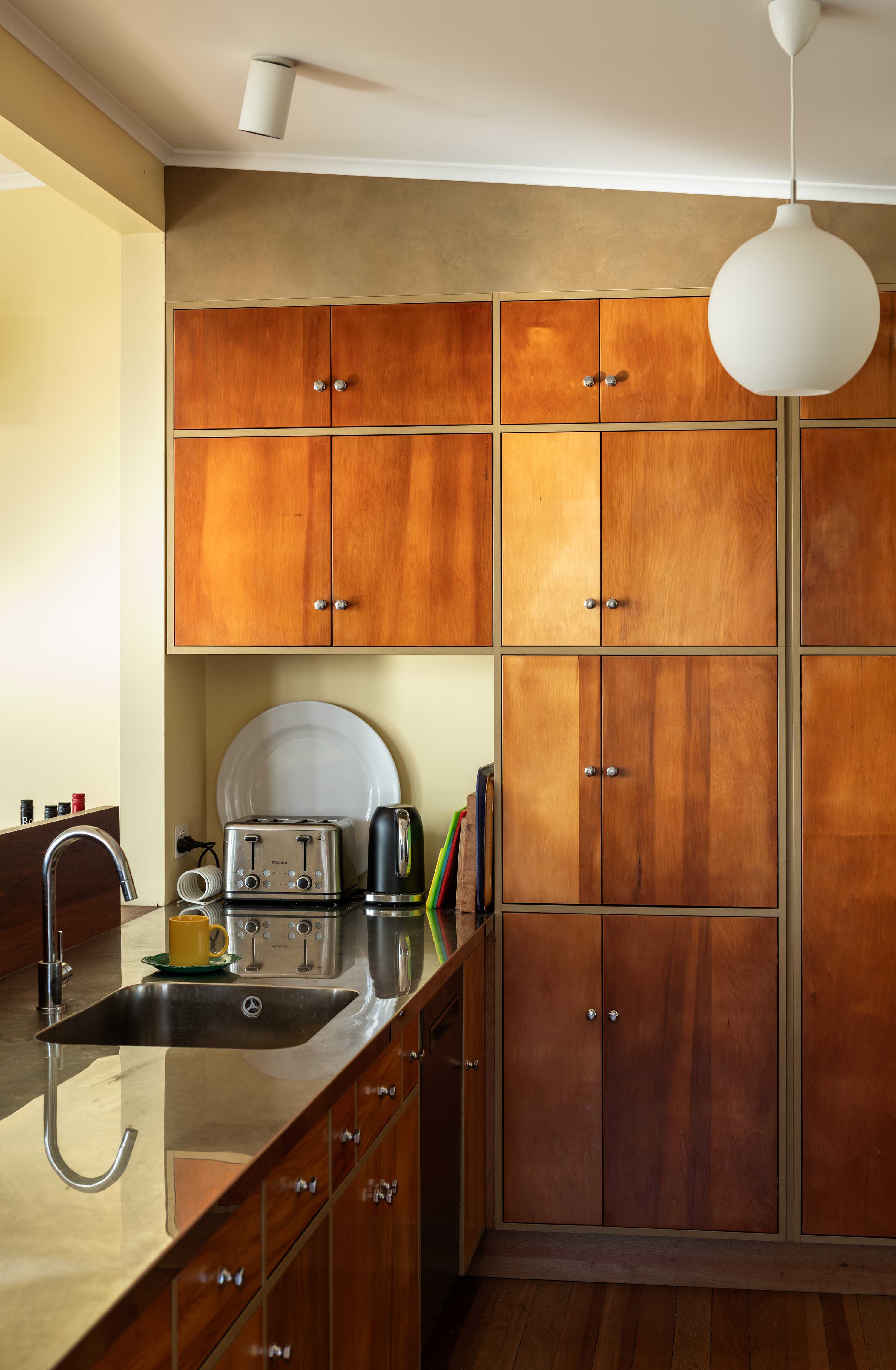 The design of the spiral stair with cross-braced timber went through many iterations before the team refined it into the clean sculptural form it is today. The result feels at once modern and timeless, precisely the architectural tightrope the whole project walks. Nothing illustrates that balance better than the kitchen. Every original 1950s door and drawer front was removed, measured, remachined and reinstated. “We worked out how to reuse 80 or 90 percent of them in the new kitchen,” Gardyne says. “That creates one of those little memories of the old kitchen.” The knobs and hinges are original too. Alongside them sits a contemporary kitchen with induction cooking and stainless-steel surfaces – amenity, but not amnesia.