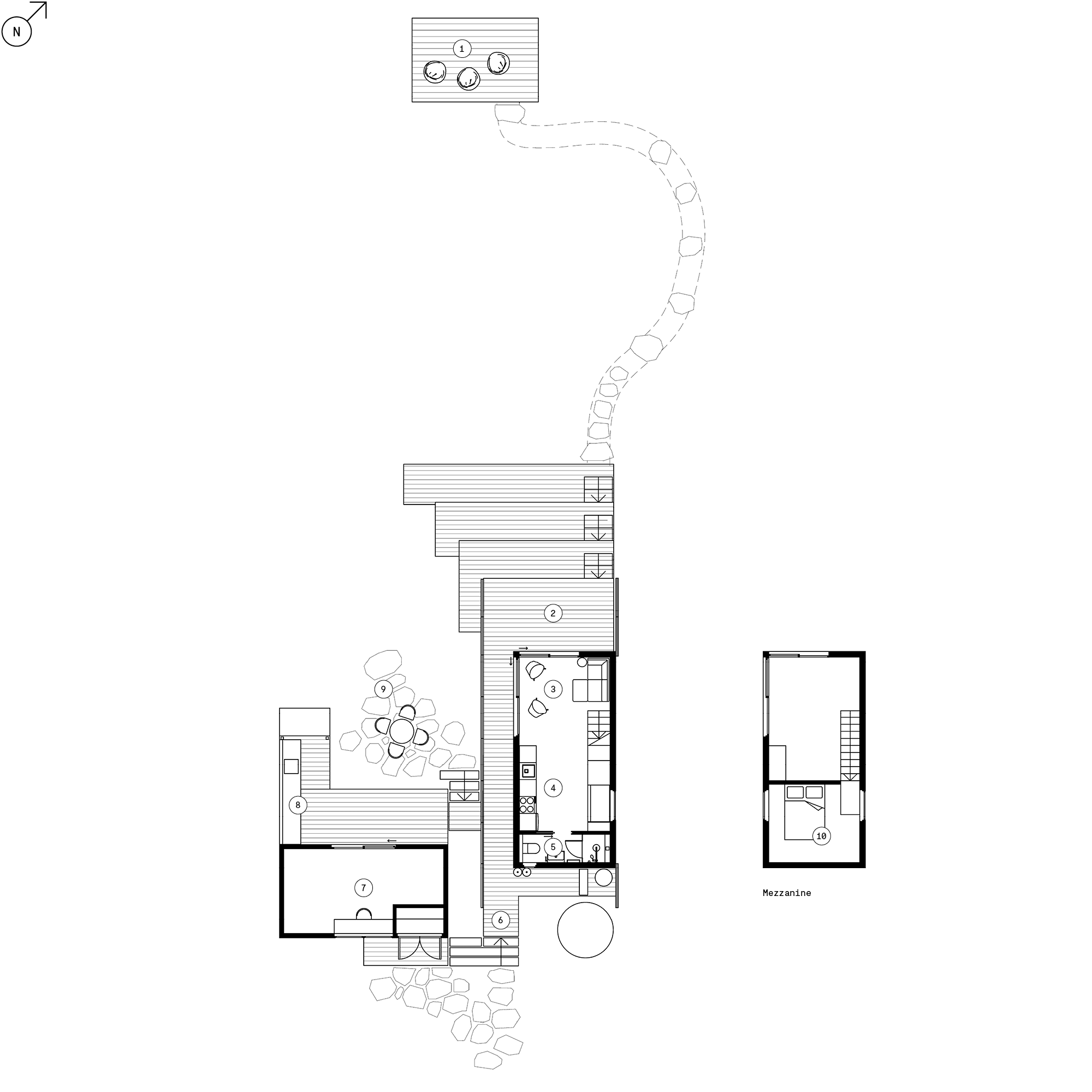 On their own, these boxes fit a familiar typology. You’ll know the rough shape from tiny homes: tall and narrow, designed to go on a truck and maximise internal volume. The key here is the roof. For the main cabin, Arch designed a wide, generous canopy, which sails down from the mezzanine and finishes just above eye level. In a single move, it creates covered outdoor space and frames the entrance into the site. It also provides shelter from the westerly sun, which is brutal.