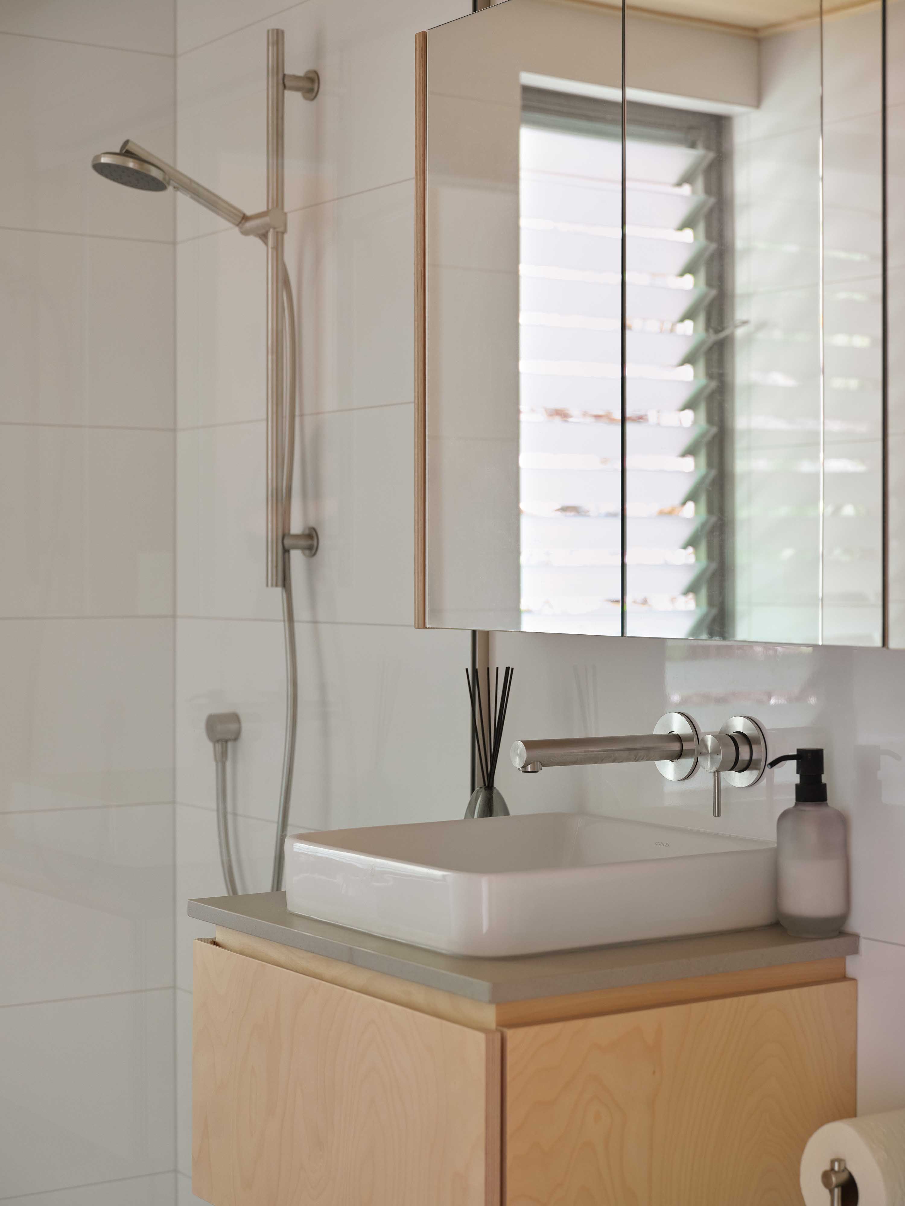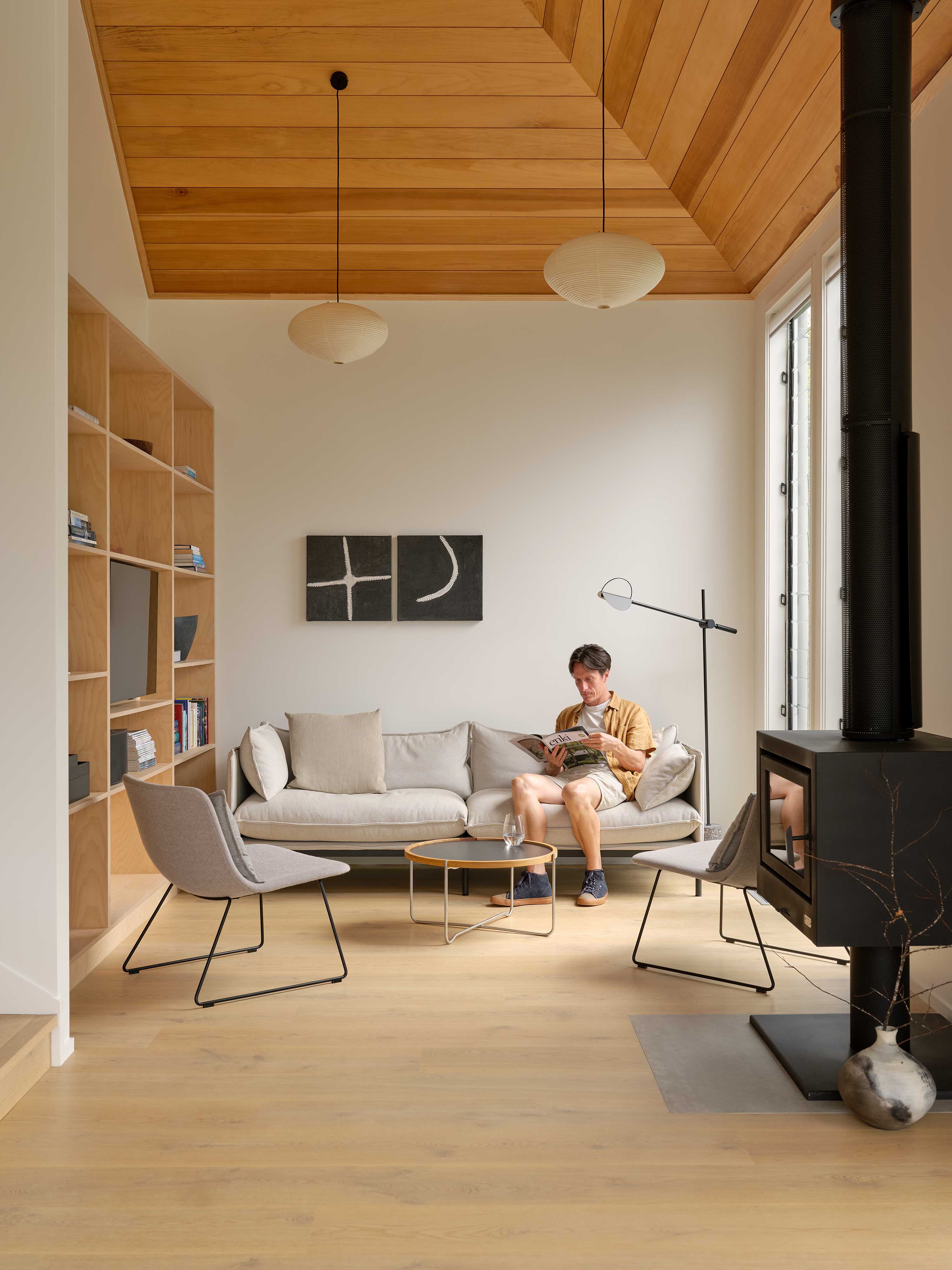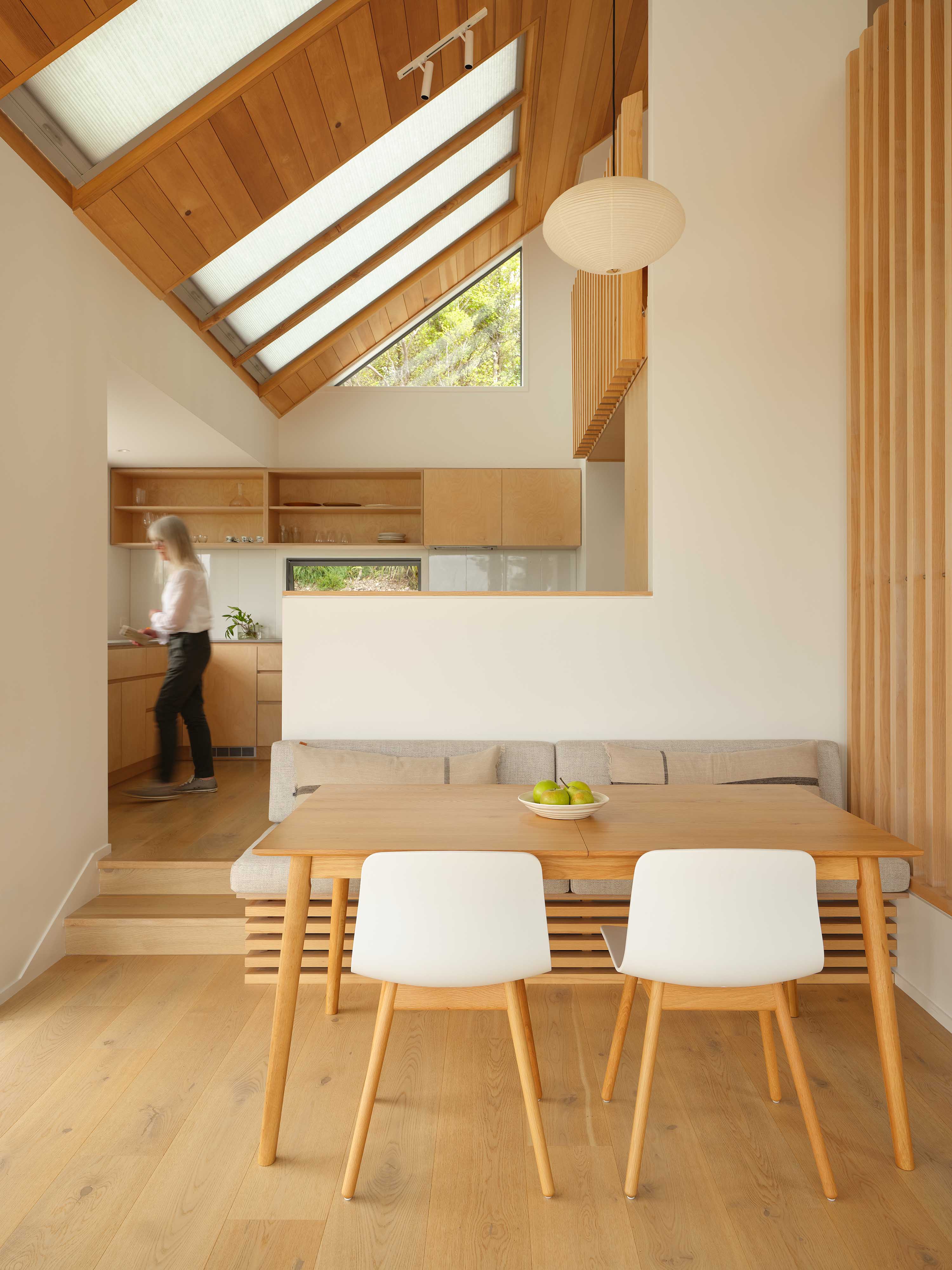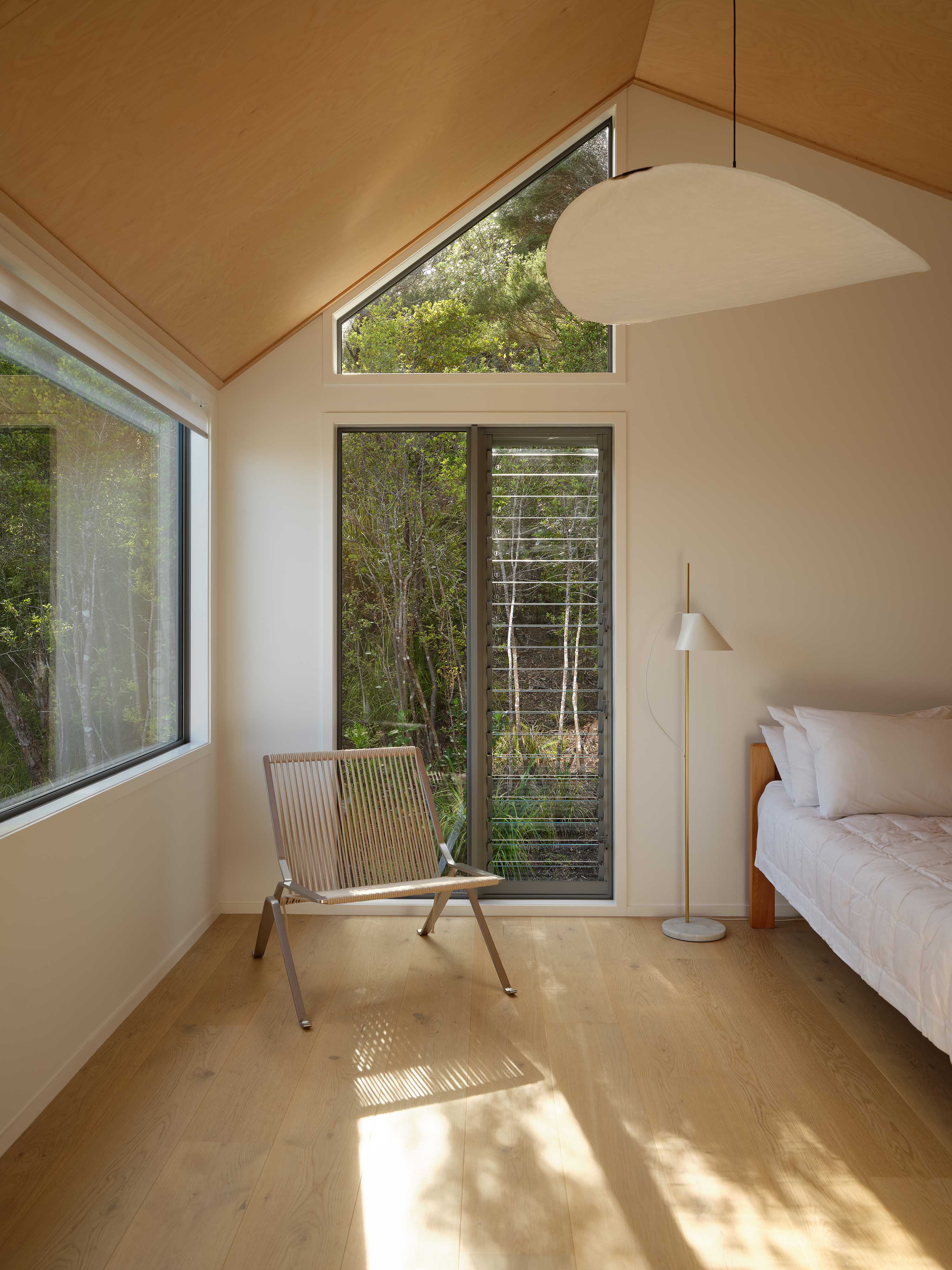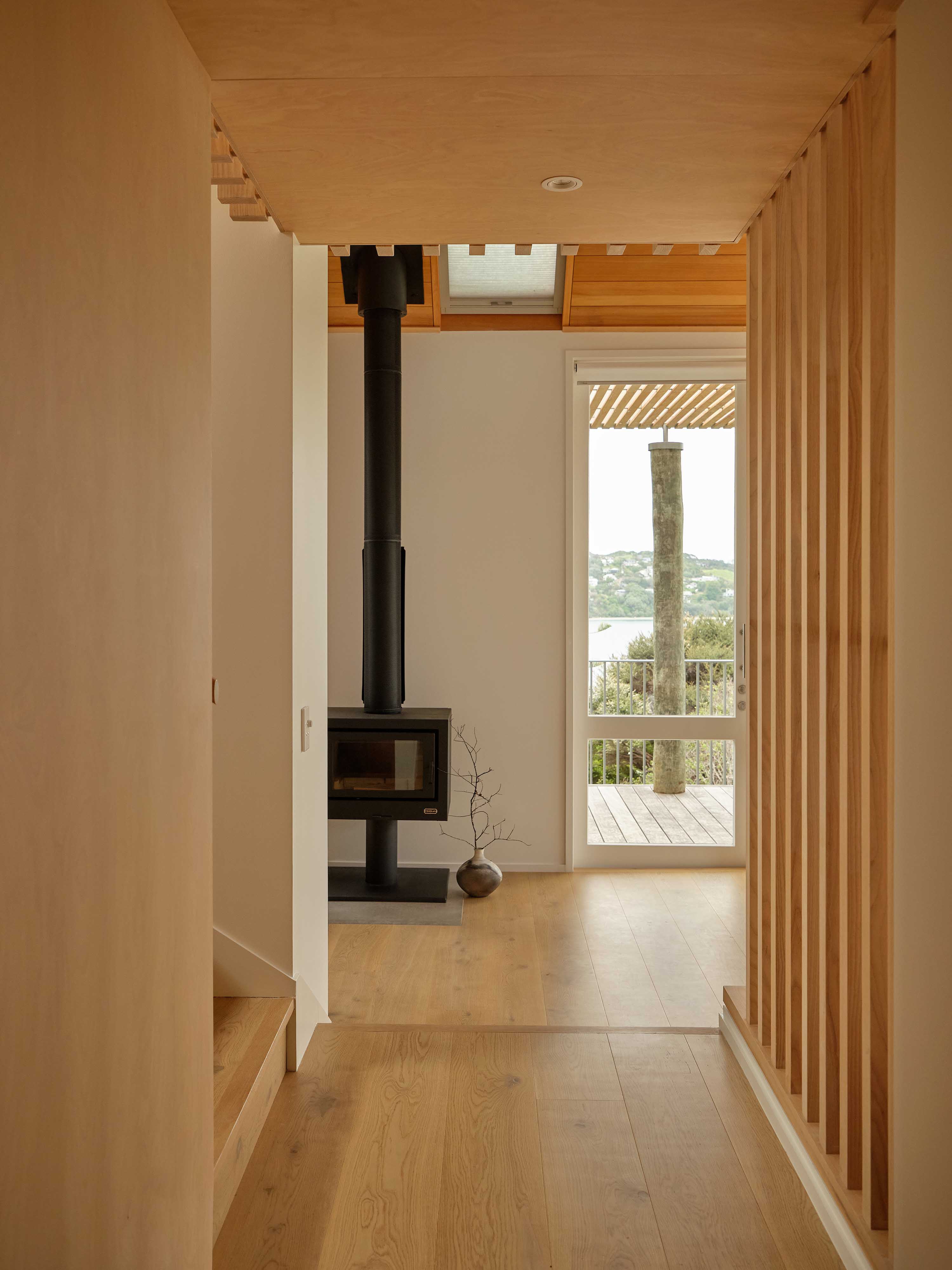 The result is serene. It honours the original parts of the house that everyone loved, while introducing a calm, consistent palette throughout – birch-ply cabinetry, large-format tiles, oak floors, white walls and Malaysian kauri ceilings. It’s spare, but not cold: there are places to withdraw to by the fire, and places to sit in the view. It’s not a big house, but it is a generous one. “This place kind of cast a spell on us,” says Desna. “It’s a quiet place, so it would just feel wrong to do anything other than what we’ve done.”
