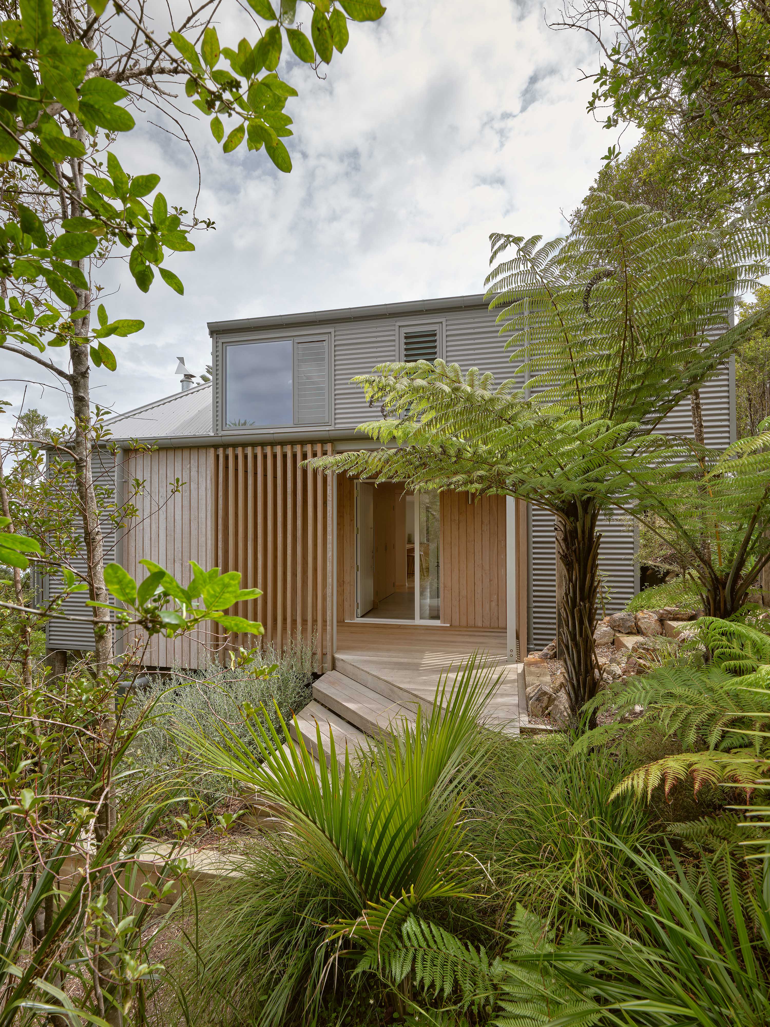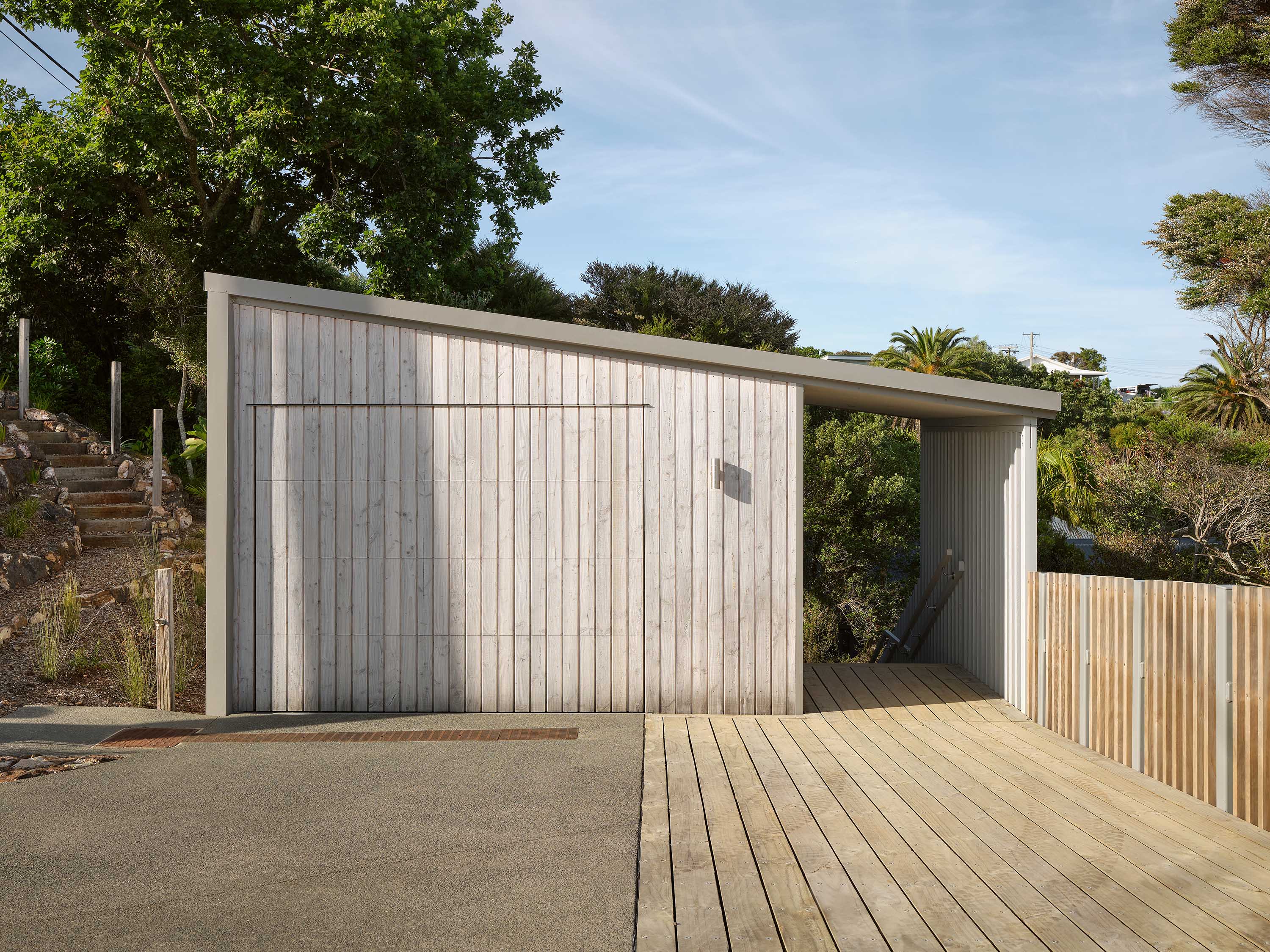 Dave and project architect Tim Sargisson’s plan was simple. At the top of the slope, they devised a single-car garage and workshop reached by a blissfully not-steep new concrete driveway, the resource consent for which can only be described as torturous. They also devised a screened entranceway under cover to the side of the garage. It provides a moment of pause before you descend the slope through a new garden, down stairs formed from reclaimed jarrah and local stone.