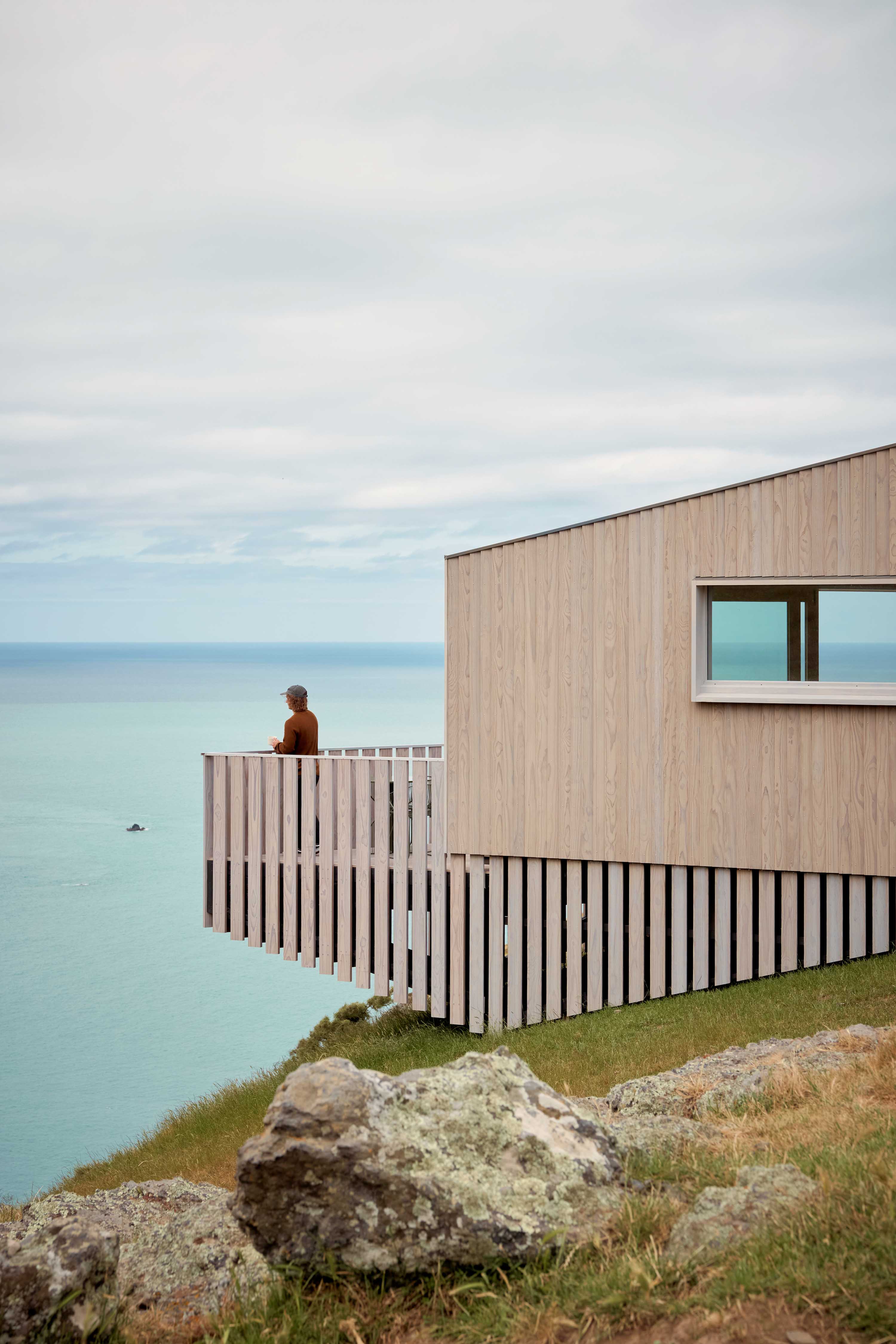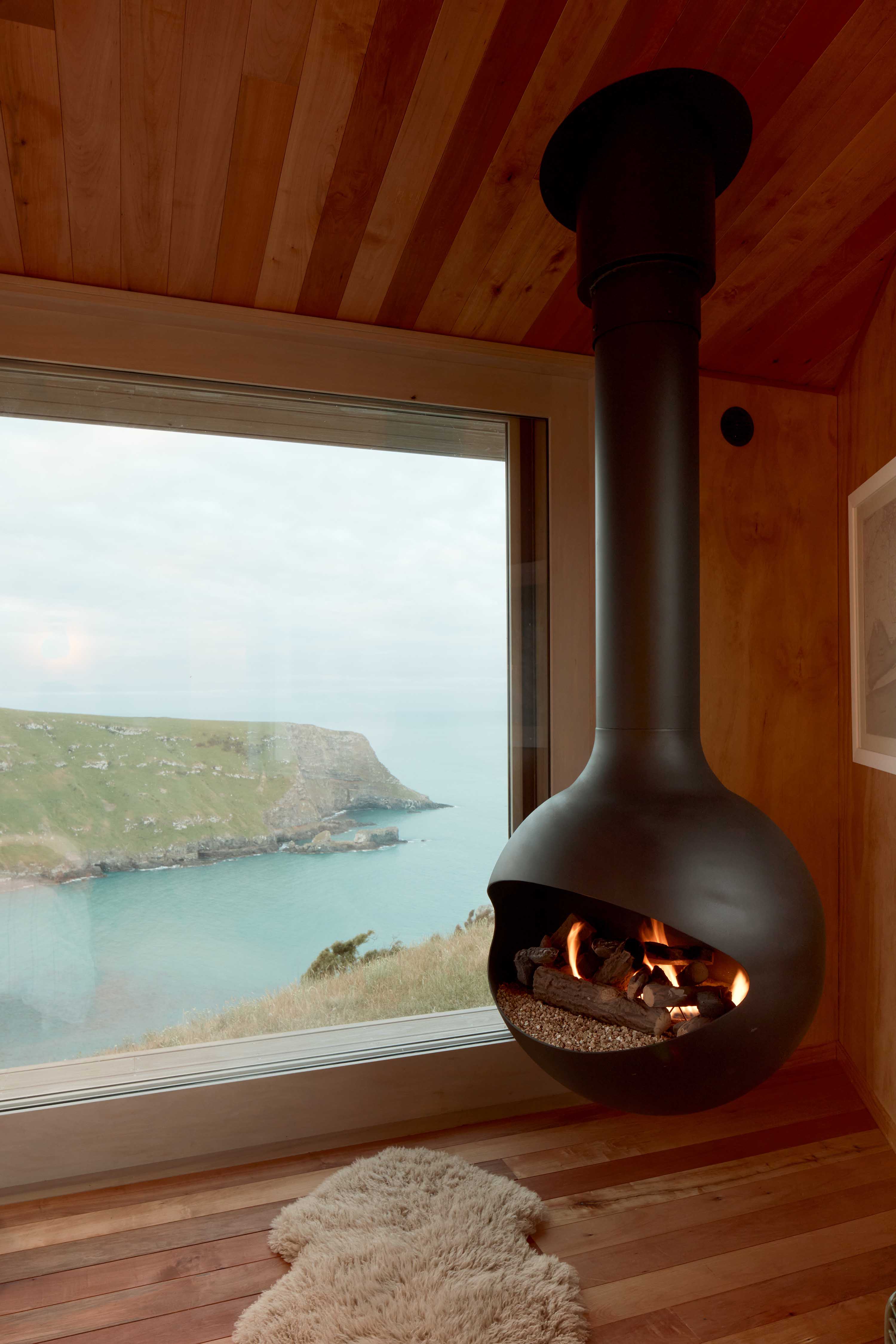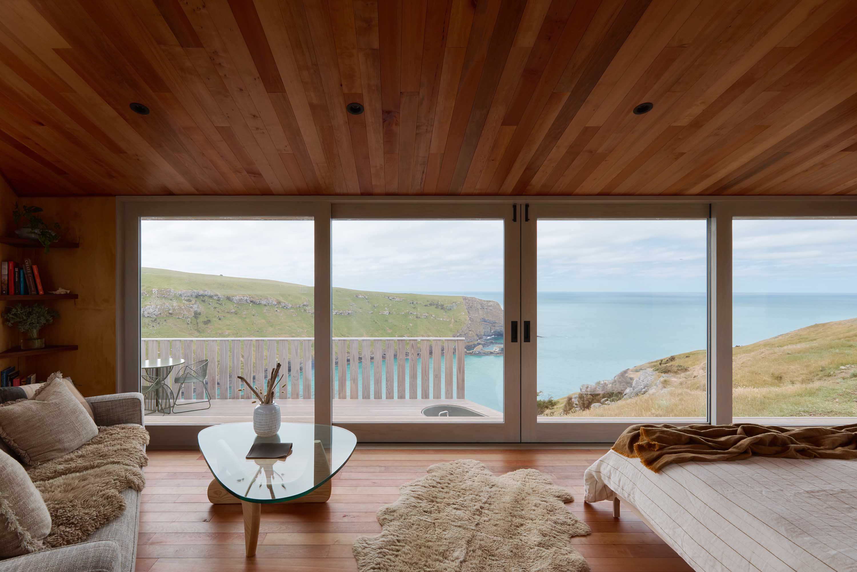 You enter the 35-square-metre retreat at the rear, stepping into the tallest zone. From there, the ceiling lowers, and the plan gently fans outward, drawing you forward to that panoramic view where the headland, sea and sky fill the frame. Designed for couples, it’s a straightforward layout that prioritises effortless comfort and a strong connection to the environment. “I wanted people to feel relaxed, protected and safe, even on a wild day,” says Comber. “An immersive experience, like you’re inside a snow globe.”