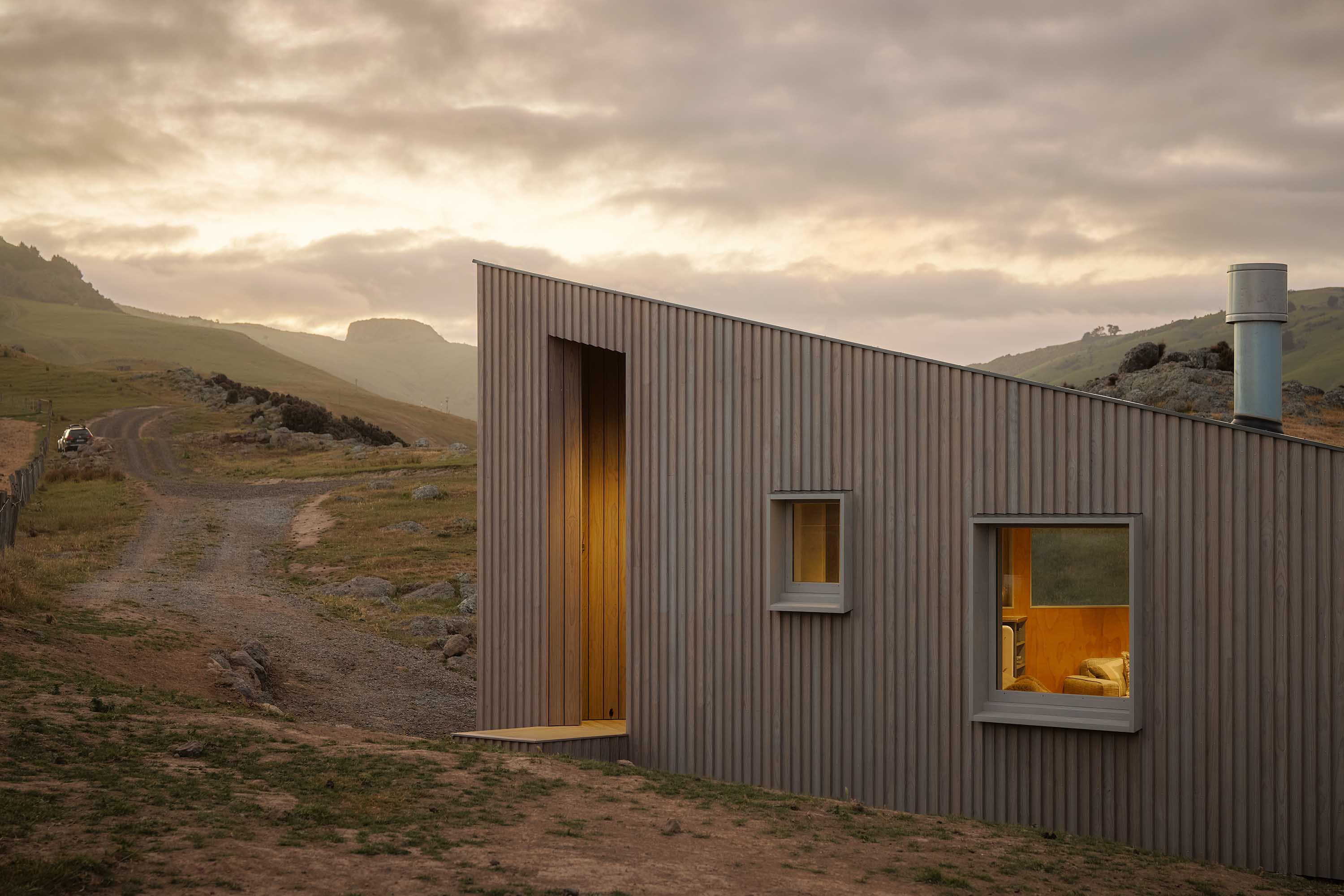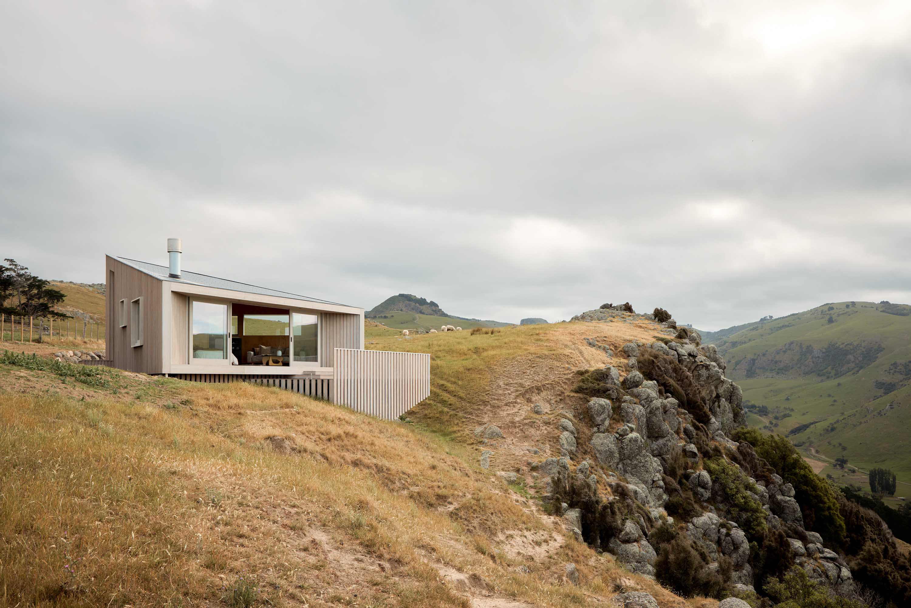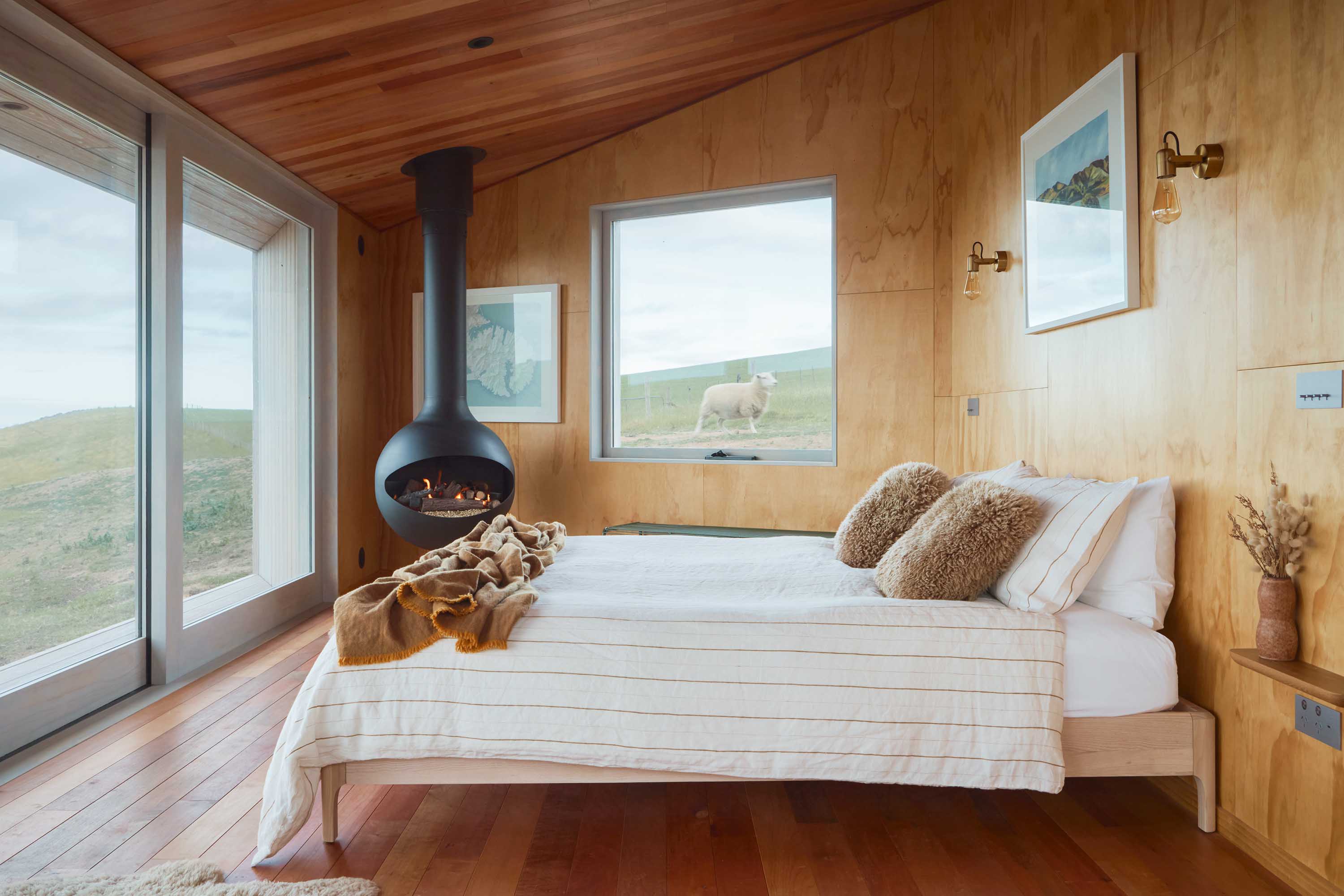 Off-grid considerations include ground-mounted solar panels, a drip-line septic system and a 30,000-litre water tank. All water comes off the farm, including from natural springs which also double as an emergency firefighting supply. The indoor fire and hot water run on gas. Built entirely on site, with nothing prefabricated, logistics were critical. The builder and most subcontractors came from nearby Akaroa, though a few made the two-hour trek from Christchurch. Even so, the cabin was completed in under 10 months and is now booked well in advance.