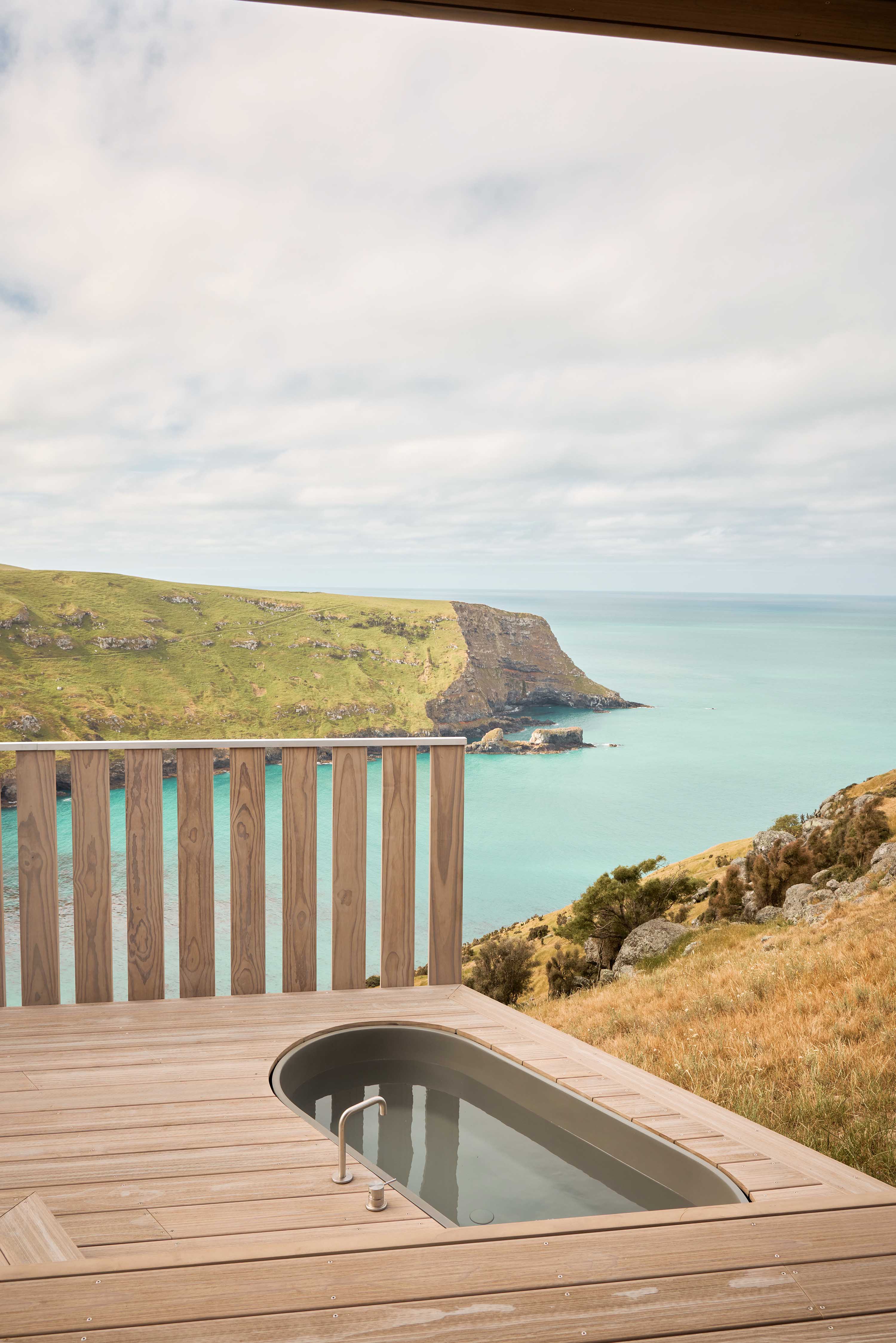 Inside, silvery-white wooden window joinery enhances the relaxed, tactile feel. It’s a credit to the Chapmans, who could have easily gone with the more cost-effective aluminium. Instead, they prioritised natural materials: floors and ceilings are beech, walls are plywood, and there’s not a strip of plasterboard in sight. Outside, the timber balustrade picks up on the agricultural vernacular, its slatted, gappy planks arranged like fence palings that let air and views through. “We stepped the bath down onto the lower deck, so sitting in it you’re right on the edge, but from the bed your view isn’t blocked by the tub,” Comber explains. It’s just one of the many moves that add to this immersive experience.