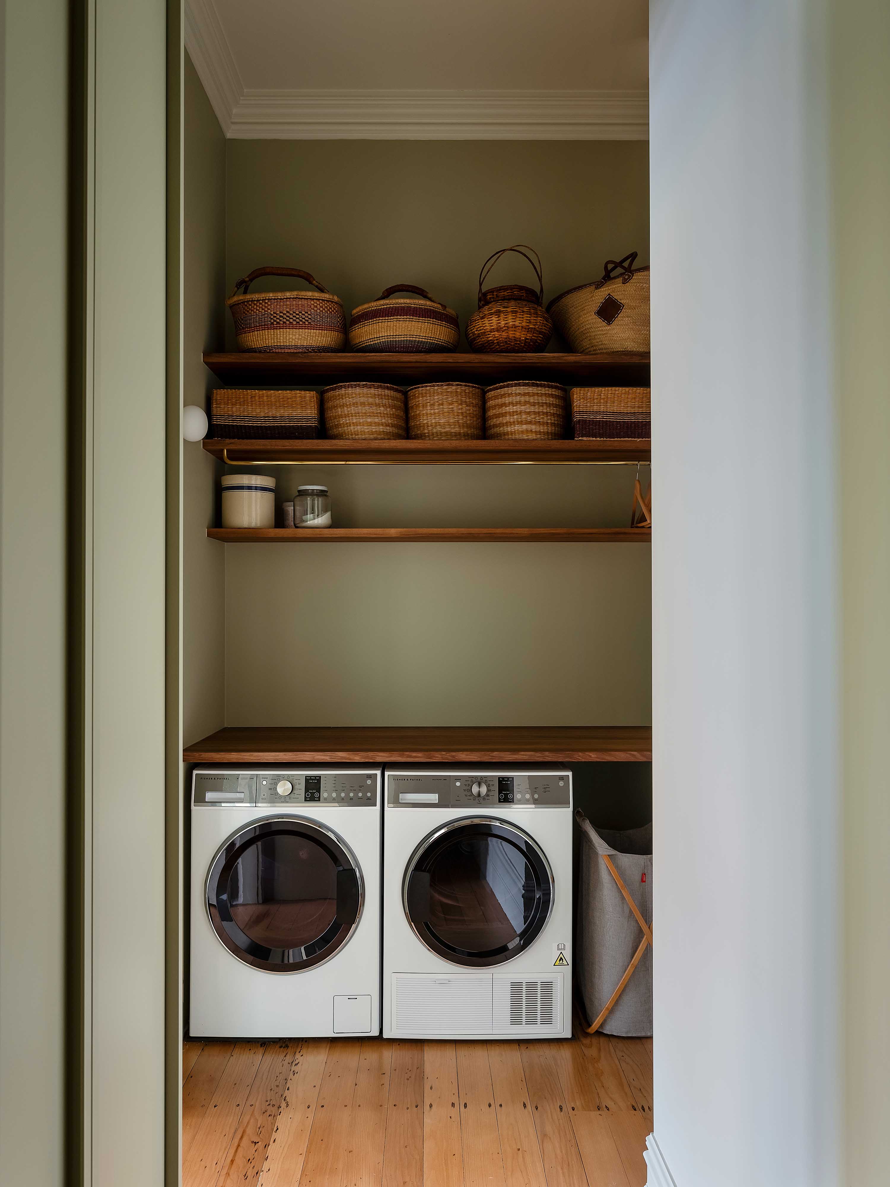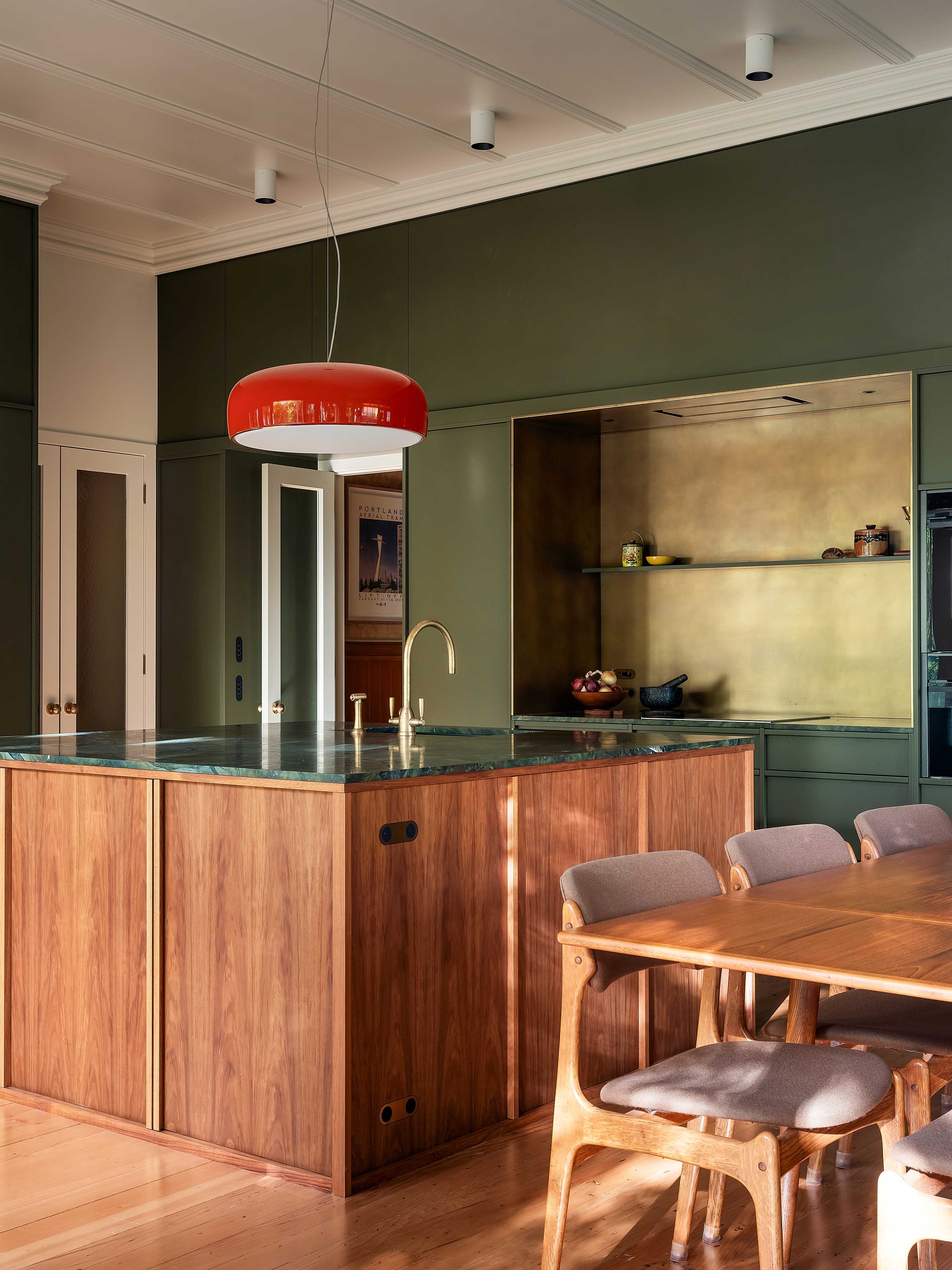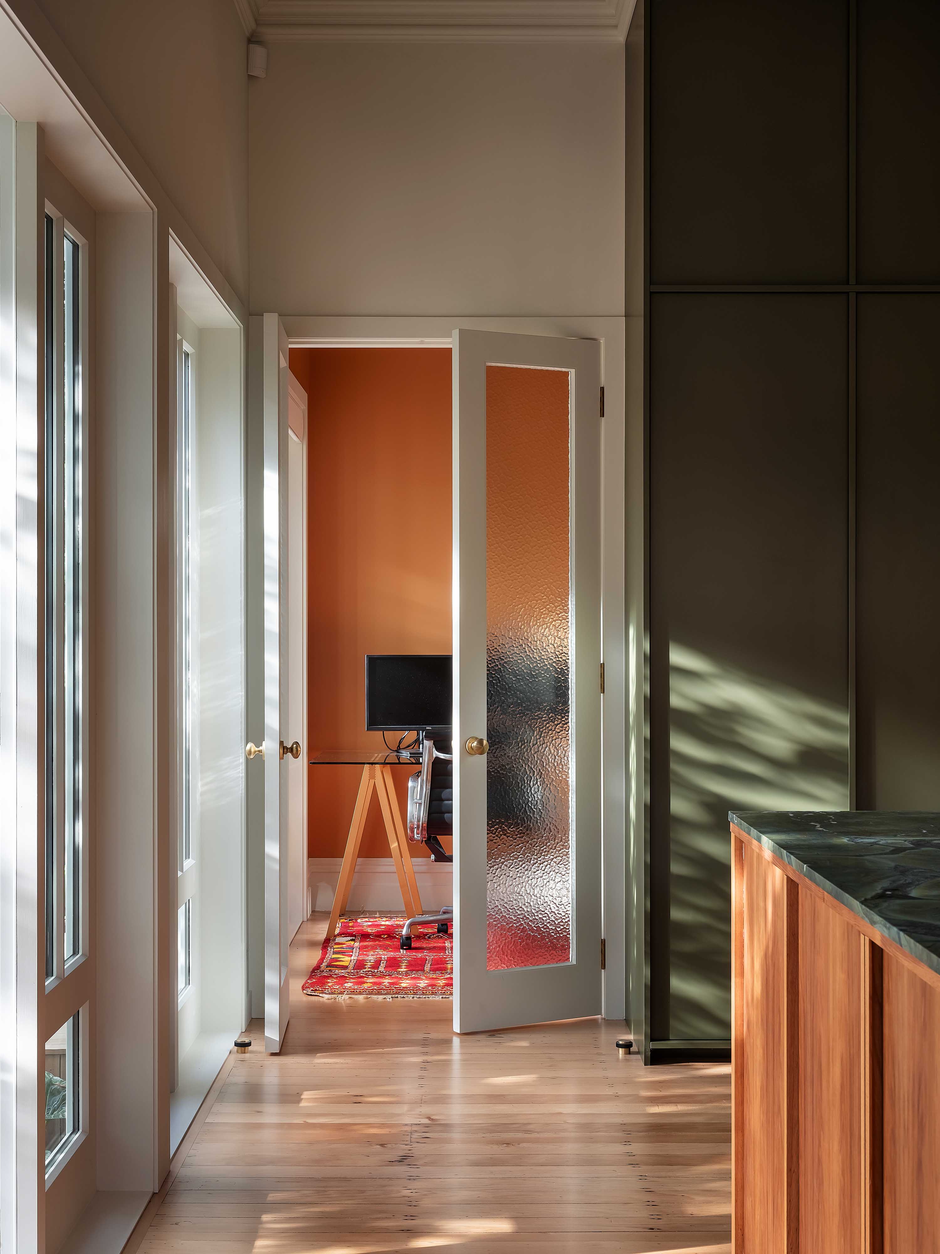 Pac’s reluctance to encroach on any previous alterations meant they made only subtle adjustments to the layout. For the most part, walls stayed put, and Mulla played the hand he was dealt, fitting the office, powder room and laundry into the leftover spaces. Impressively, no room feels compromised; each is practically occupied, including the office that now hangs off the back of the kitchen. While small, its glazed doors keep things light, and its punchy orange wall in Dulux Fortrose matches the front entrance and ties in handsomely with the home’s green elements.
