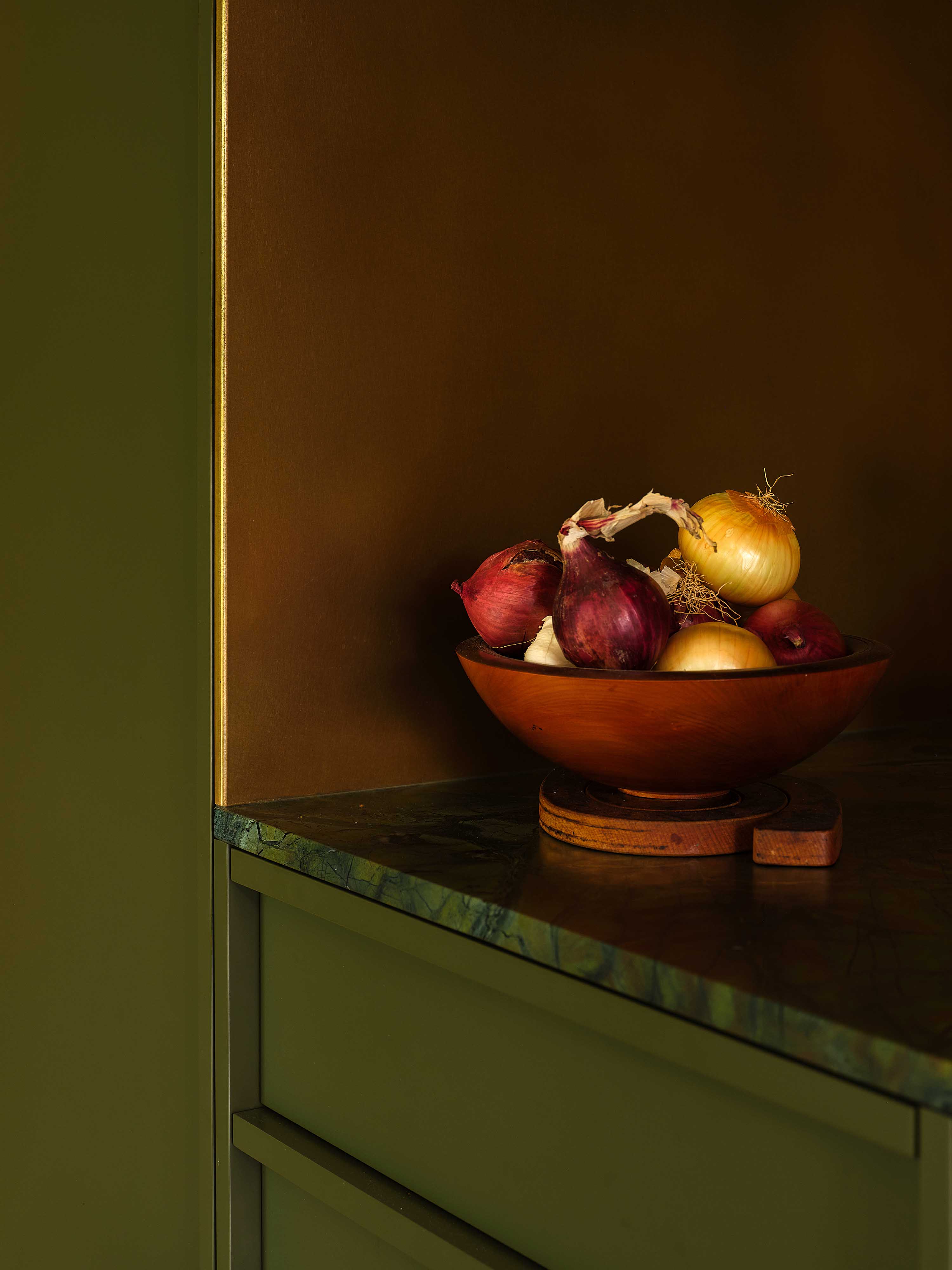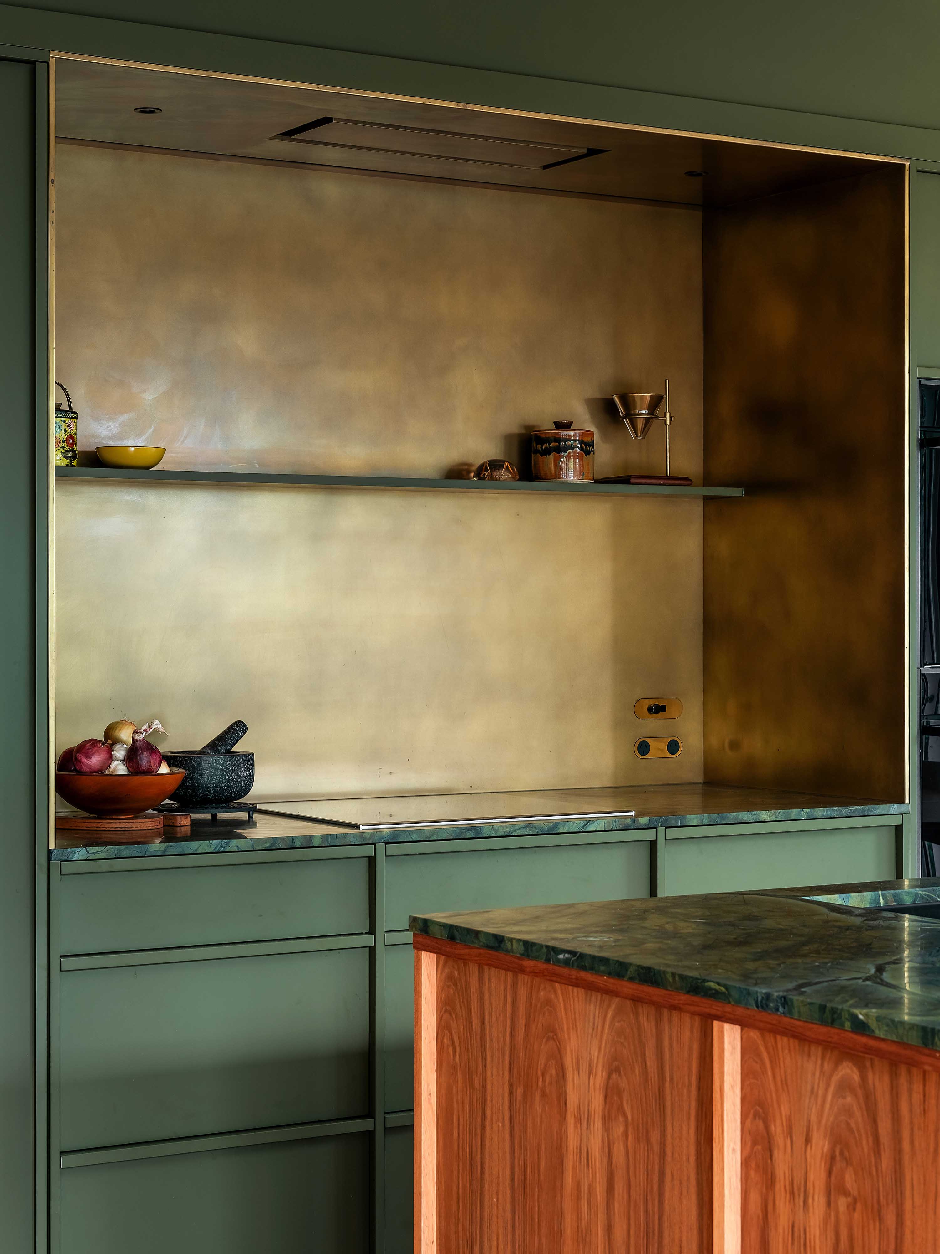 As per the brief, the material palette is disciplined, including no unnecessary hardware, frills or flounces. Instead, the focus remains on design and finish. The patinated brass cooking recess adds an organic feel – natural light bounces off it, bringing movement to the room. The tap, door handles and lights use the same soft metal, and will continue to mellow over time.
