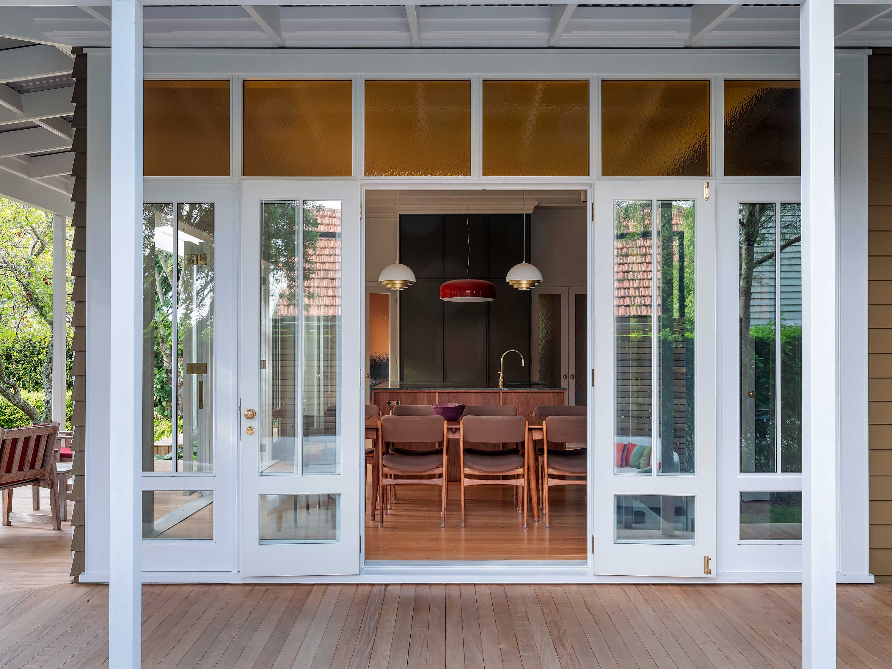 Looking back at the home from the garden, you’d be hard-pressed to determine which parts this project has touched – and that’s precisely the point. “In my previous life working in heritage conservation, that was always the game. You can tell what’s new, but you really have to be looking,” explains Mulla. The design picks up on the home’s heritage language, wrapping the renewed kitchen-dining area in glazing that emulates the existing. This tall bank of doors and fixed panes is topped with dimpled amber glass that casts a soft, honeyed glow inside. It all opens out to a wraparound verandah, which forms that missing link into the garden.