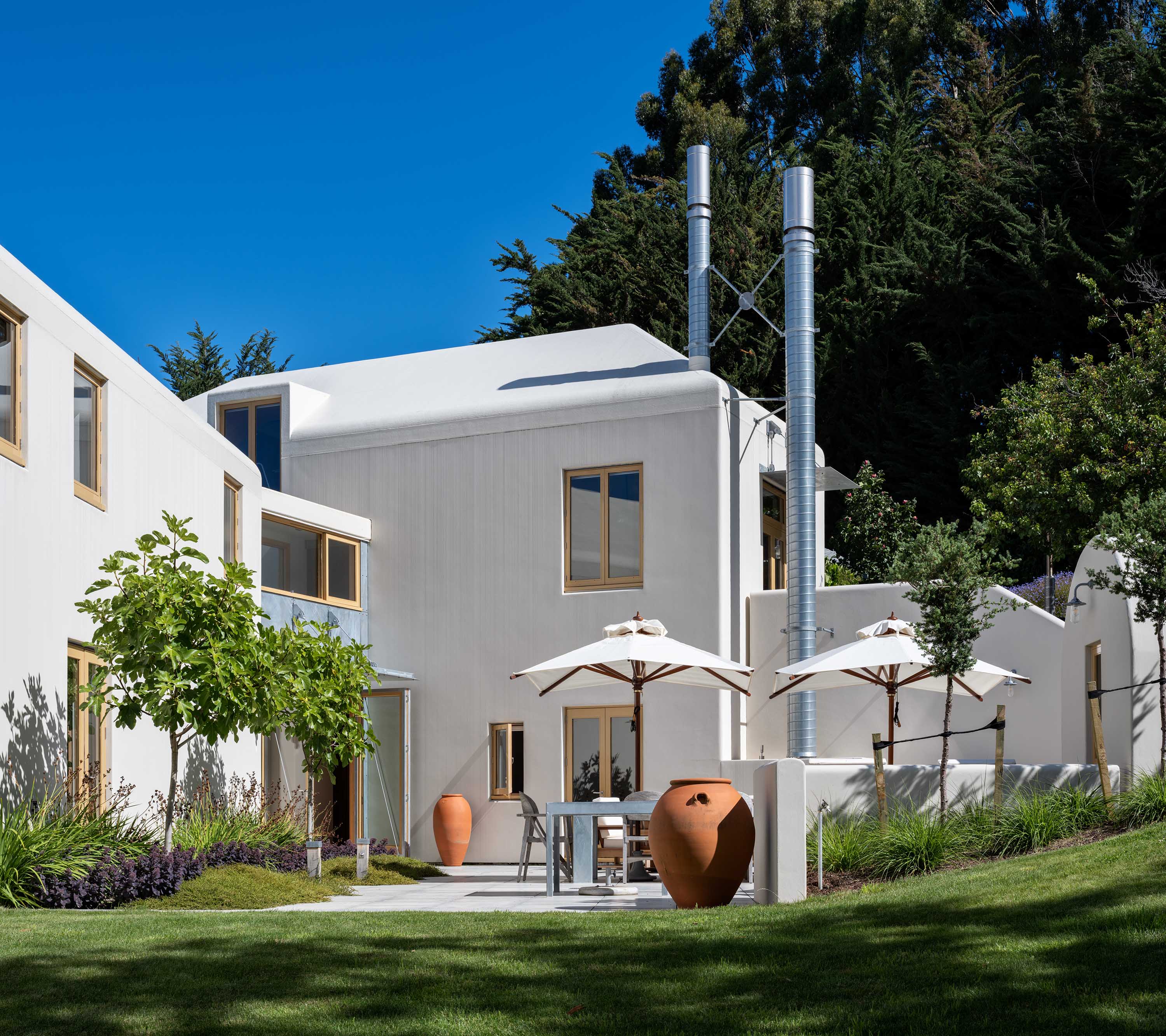 It’s also filled with creative responses to design challenges: a fire pole that provides safe access from the kids’ room to the living room below; a winch system that hoists the TV up into the ceiling and out of sight; and a grated steel wall that slides open to accentuate the volume of the primary wing. Unsurprisingly, there were tiffs with the council, but rather than reining in the home’s whimsical idiosyncrasies, the clients embraced them – as evidenced by the kinetic fish and bird sculptures (designed with friend and artist Sam Mahon) that come to life as you arrive.