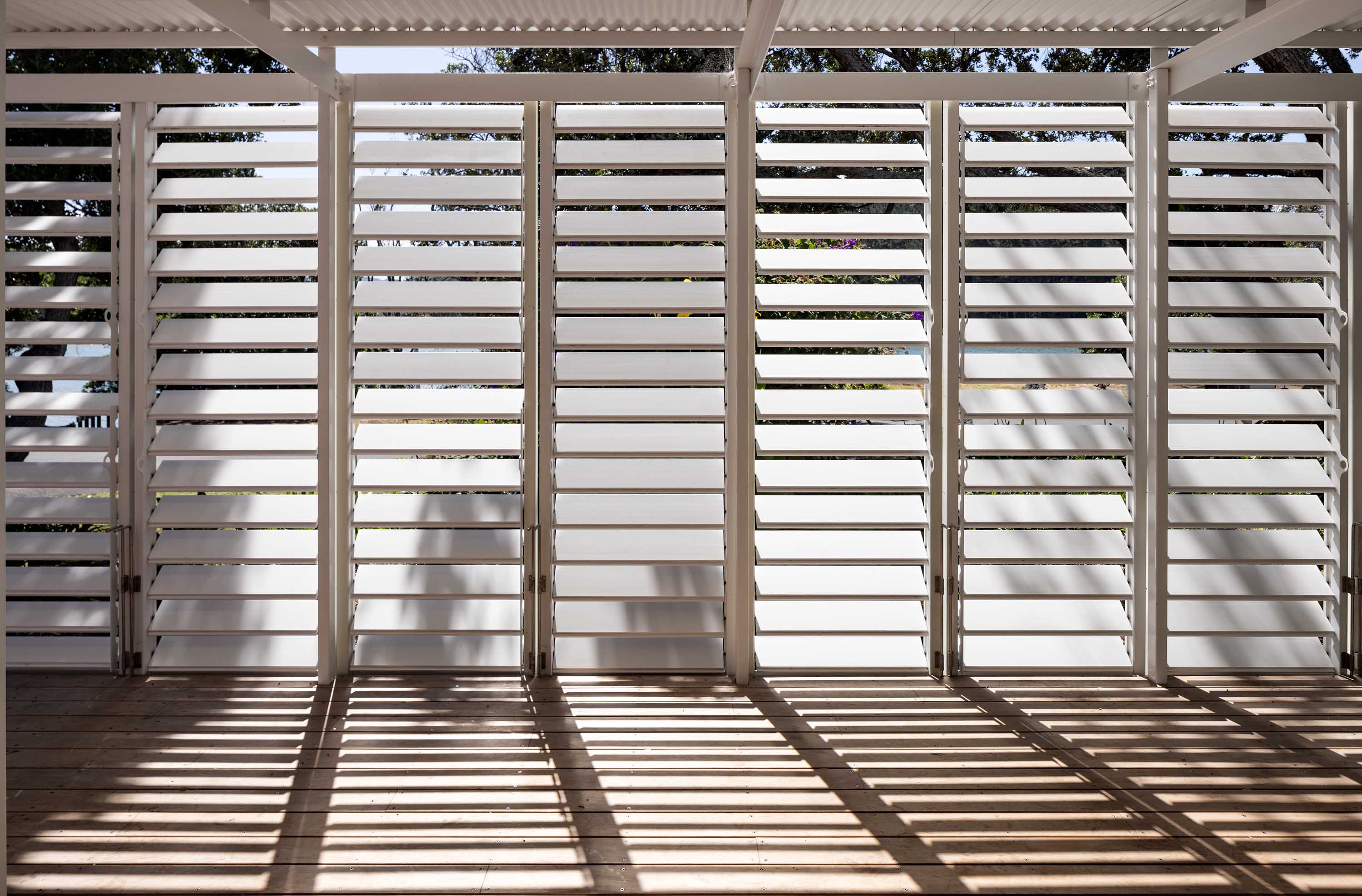An immediacy of connection to these pocket gardens was paramount, but so was a close visual bond with the pōhutukawa that bound the site. These were carefully picked around during the building process and now clerestory windows that kick up to three metres allow eyes on the prize. “They’re set on an angle that aligns with the trees so, when you tilt your head to look up, there’s no distortion,” says Paterson. Inside, this has the effect of evaporating the roof; there’s nothing to detract from the branches that stretch overhead. Leaf-like patterns dance across the walls and oak floors, while the roof edge casts a slow-moving, crinkle-cut shadow. This aluminium sheaf with exposed detail, which Lloyd describes as a “corrugated aerofoil”, is a graceful lid on the dwelling, a contemporary take on the material commonly used in Pacific architecture and bach construction.