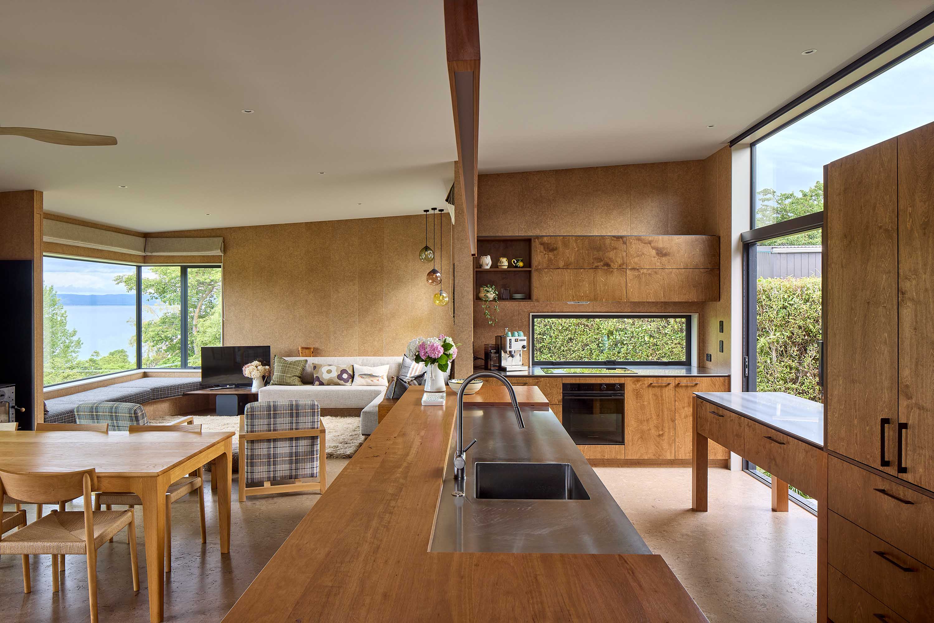 Designed for year-round use, the house opens easily in summer, yet remains warm and inviting through winter. The heavily insulated walls, floors and roof are paired with thermally improved Altherm joinery, while a central woodburner brings a layer of warmth and romance. By blending the natural materiality and informality of a lakeside bach with sensible spatial planning tailored to the family, ata has created a holiday home that honours its past and prepares to carry the owners, their children and their grandchildren into the future.