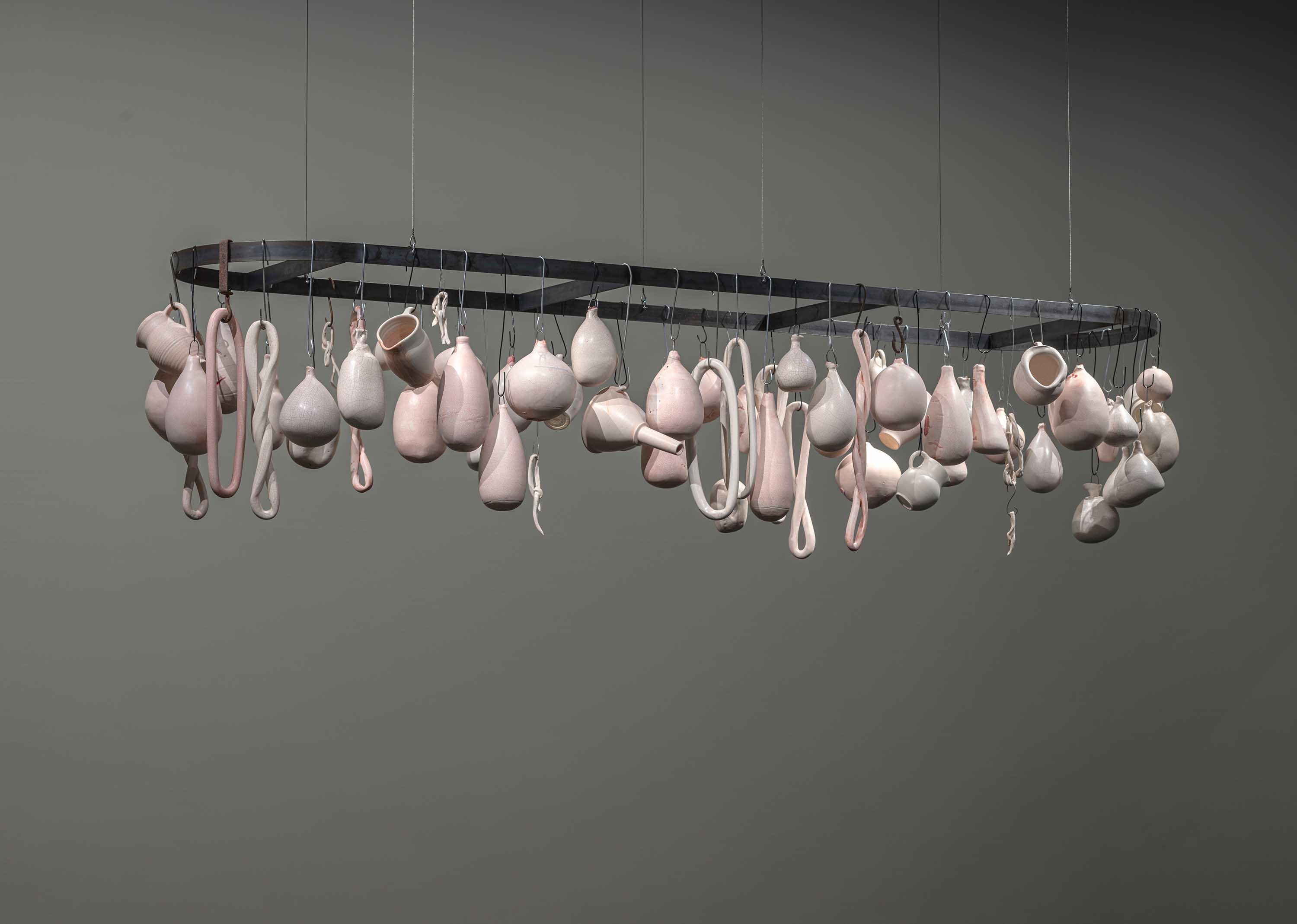 “The earthquakes were the impetus for Harder Larder (2011), intended as a reflection on the inadequacies of modern life, our vulnerability with supermarket dependence which can be shattered in a shake or two. The forms themselves were a nod to on-farm food self-sufficiency and storage.” The earlier Skin Fence, 2008, was prompted by a memory of Lucas’ father “borrowing a kitchen jug for a farm concoction, rendering it unfit for further domestic use, and the fence lines of rabbit pelts from the rabbiter’s tallies.” Here the jug is a symbol of plenty, “once full, now depleted, not unlike the rabbit-stripped land”.