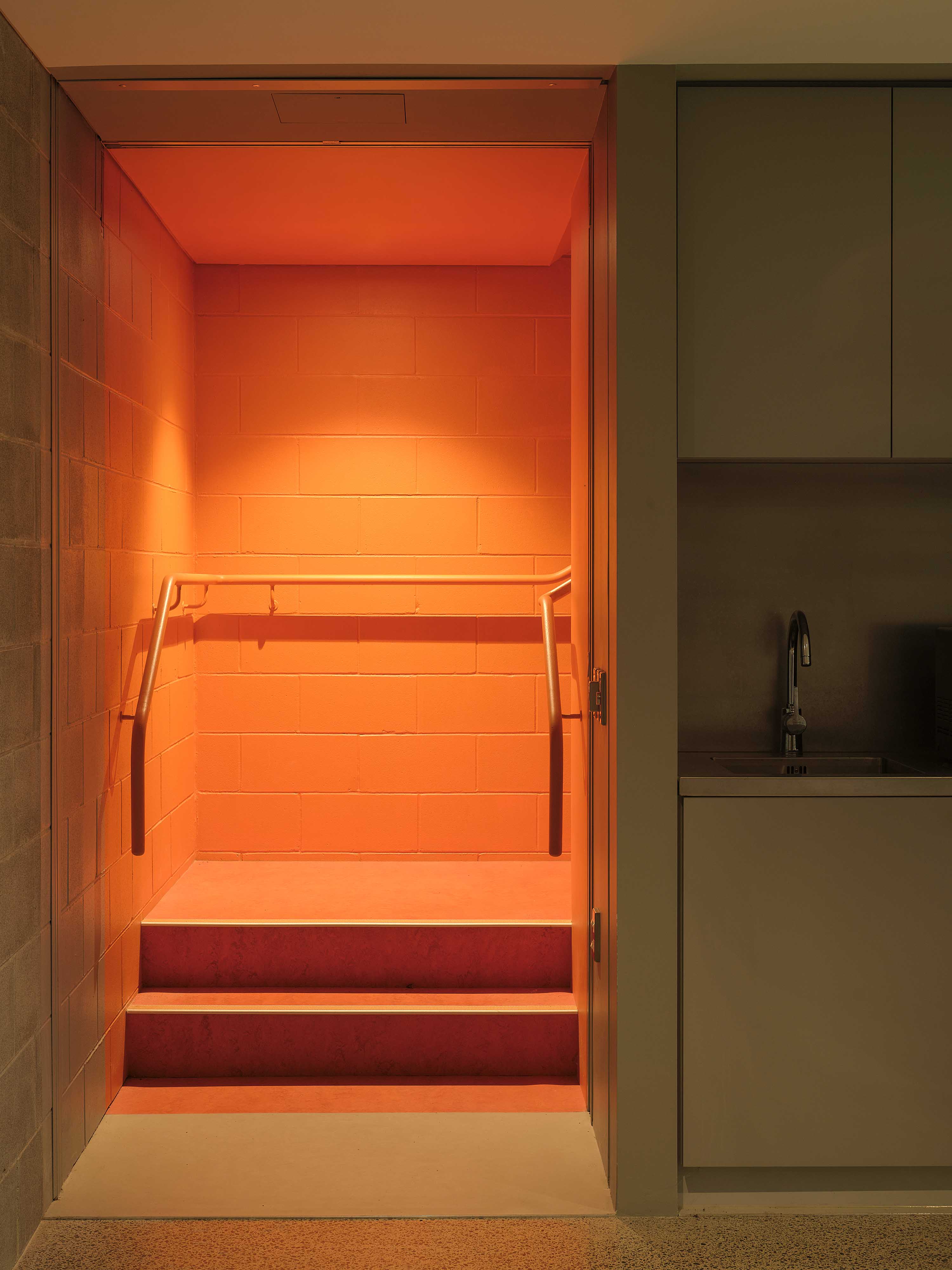 The details are key. Carefully placed windows offer sightlines across the whole church site, as well as to Ōwairaka and Maungakiekie. The rainscreen is precisely designed to the size of the fibre-cement boards, on a 600-millimetre module, all of which was worked out and drawn before the building went up. Inside, it’s just as rigorous, with a minimum of materials and colours: a concretey sort of grey, emergency orange, birch ply. Upstairs, the space is airy, with a wall of floor-to-ceiling shelves built from 30-millimetre birch ply. It feels generous, despite its frugal budget. “It really is a simple thing,” says Barrie. “There was a lot of talk about the respectable minimum.”