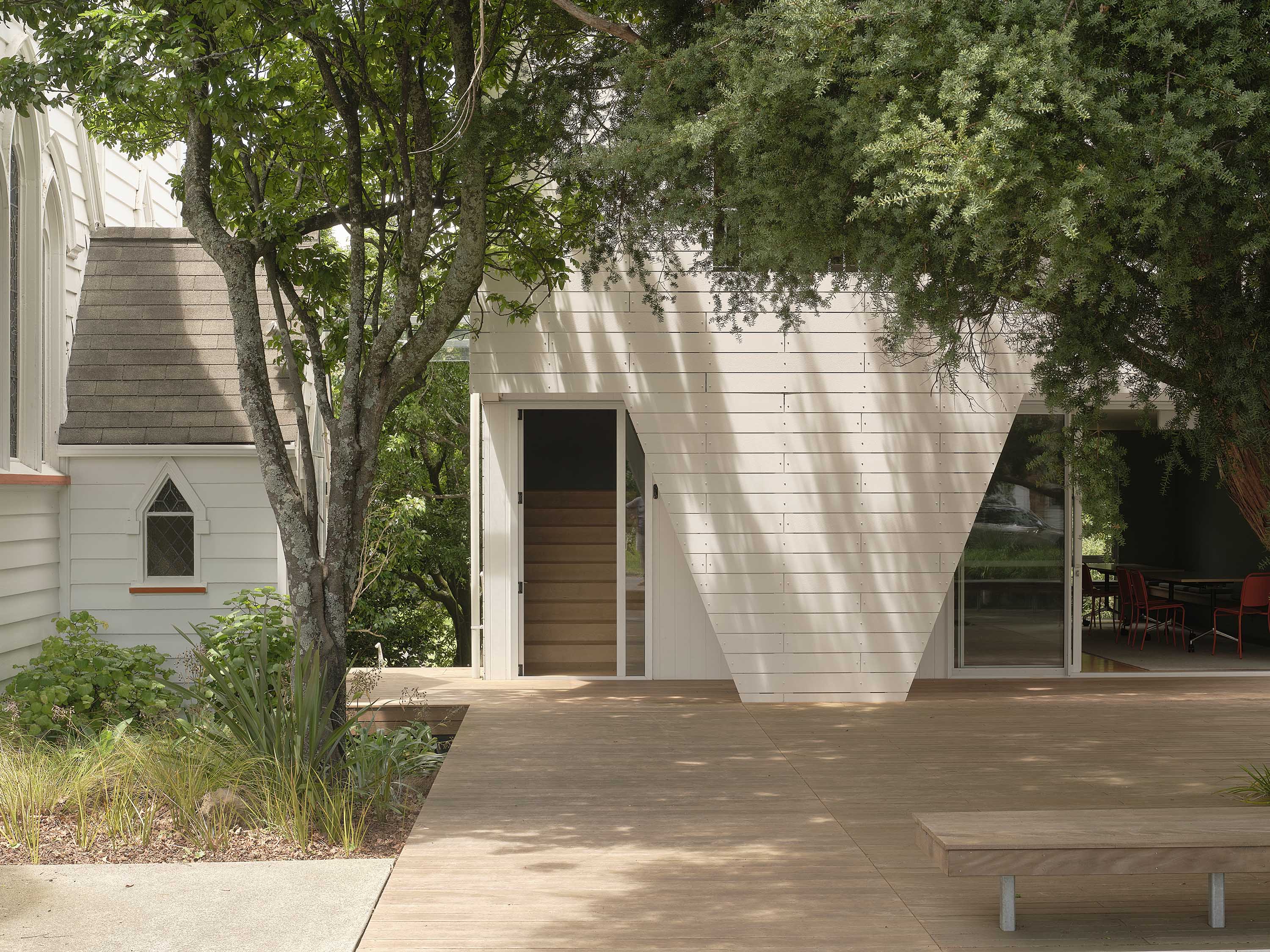 Eventually, after many discussions and sketches, Barrie devised a three-storey tower, built on the site of the old garage. There’s an office-for-rental at basement level, social spaces (for both the congregation and for hire) at ground level, and office spaces and meeting rooms on the top floor for The Reverend Barrie and an administrator. In front, built around a majestic tōtara planted to commemorate the centenary of the church, he designed a generous deck, level with the church floor, that solved most of the site’s accessibility problems in one simple move.