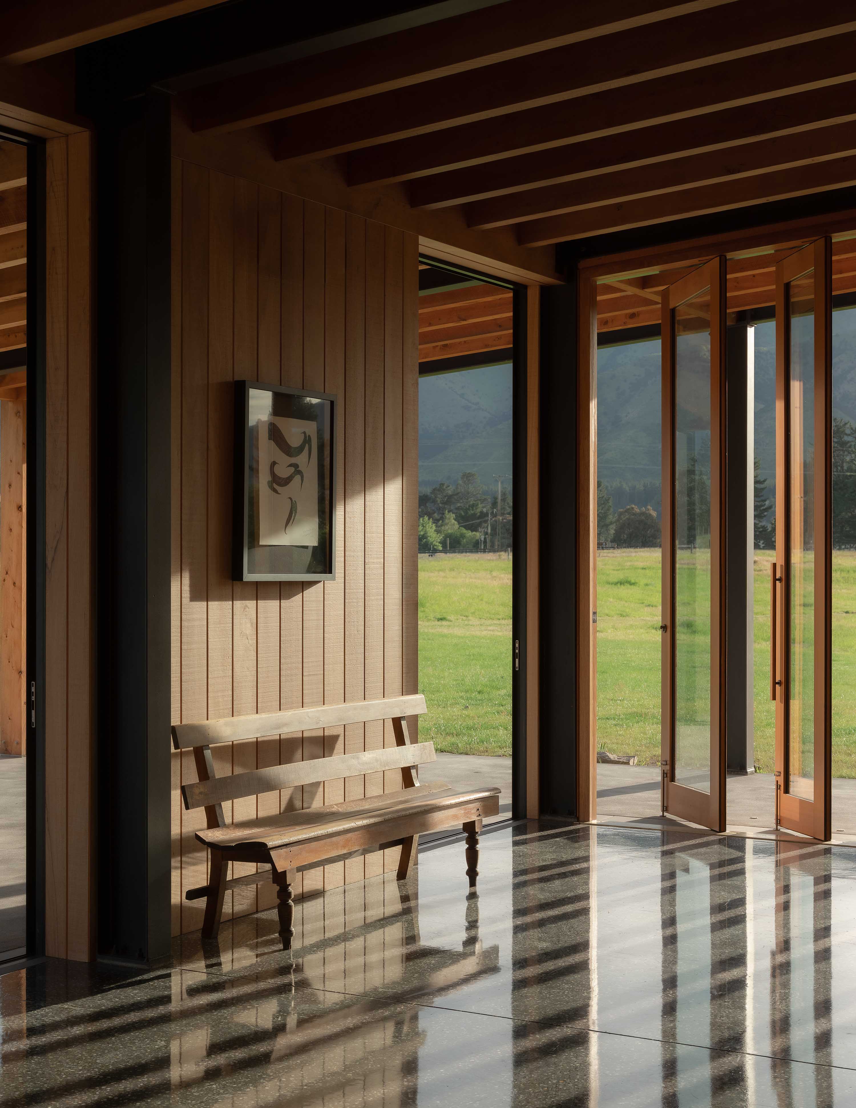 There were a few design decisions they all agreed on immediately: the building would use a limited palette of basic materials – concrete and steel portals, and massive macrocarpa beams, paired with rammed earth. Tarrant had admired a few rammed-earth buildings over the years. “There’s something about that material in that landscape – it’s a bit like a desert,” he says. “It’s just really beautiful.”